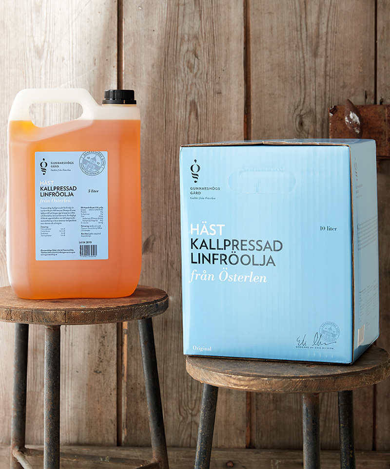 Vi erbjuder även kallpressad linfröolja till häst och hund. Den är mycket rik på Omega-3, som behövs för kroppens celluppbyggnad och för att förstärka immunförsvaret. Ett dagligt tillskott gör pälsen blank och lättskött. Vi har också kallpressad linfröolja förstärkt med extra E-vitamin, motsvarande 1000 mg/dl. Denna produkt lämpar sig särskilt bra för högpresterande hästar i träning och tävling. Kan också ges i förebyggande syfte för att undvika muskel- och ledproblem.