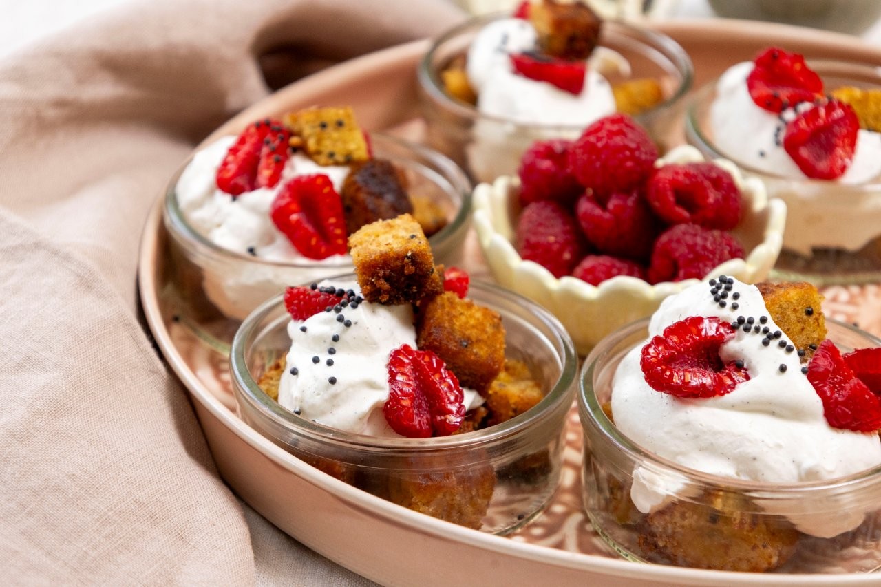 - Låt kakan svalna, servera sedan med lättvispad grädde, färska bär och rostade rapsfrön.